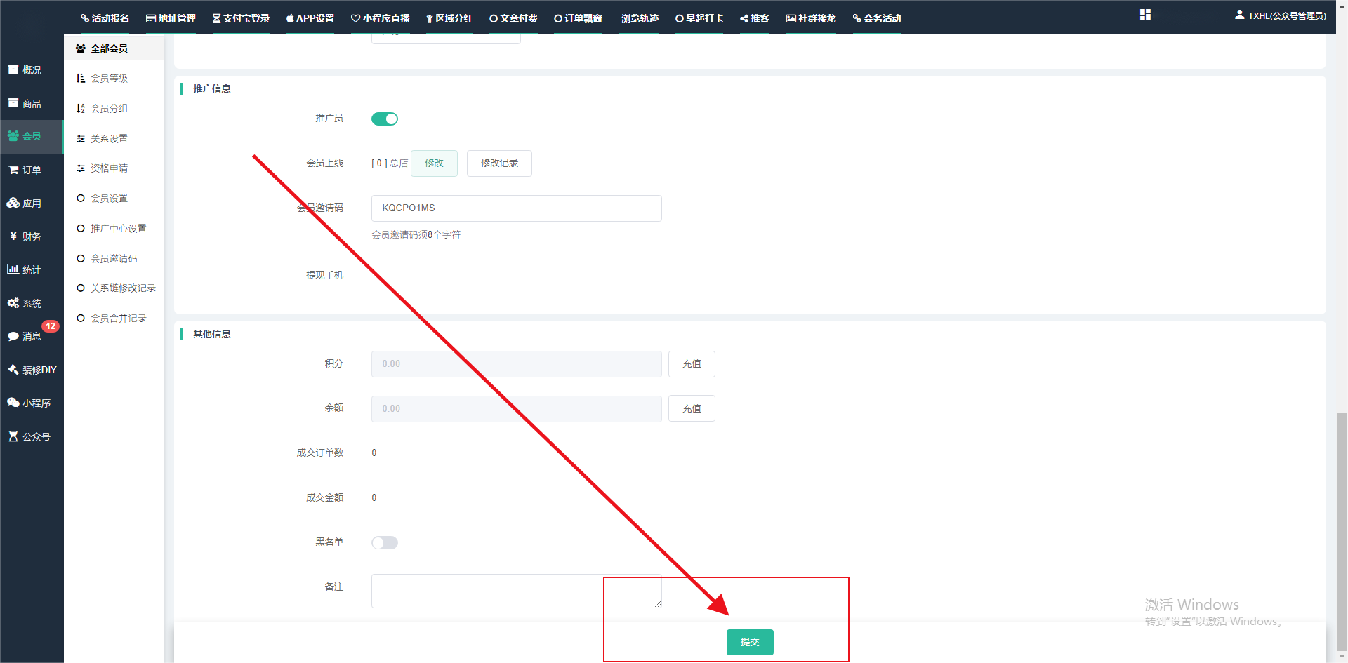 目录 搜索 展开 一、前期准备资料二、数字乡村码-上线操作指南1、服务号的申请流程及认证2、申请小程序流程3、开放平台绑定小程序和公众号三、数字乡村码-系统操作数字乡村码系统管理-概况数字乡村码-商品管理1、发布商品2、商品列表3、商品表单4、商品分类5、品牌管理6、配送模板7、评论管理8、优惠券管理9、商品标签10、退货地址设置11、满额优惠12、批量操作13、配送方式14、基础设置15、商品隐藏四、数字乡村码-会员管理1、全部会员2、会员等级3、会员分组4、资格申请5、会员设置6、推广中心设置7、会员邀请码8、会员关系链修改关系链修改记录9、会员合并记录10、账号注销管理11、会员设置中心五、数字乡村码-订单管理1、订单管理列表2、订单处理流程3、订单状态4、订单修改价格5、订单退款退货6、多包裹发货7、批量发货订单操作步骤8、催发货订单9、物流查询六、数字乡村码-财务管理1、余额设置2、会员余额3、充值记录4、转让记录5、余额明细6、收入明细7、提现设置8、提现统计9、积分管理10、转账审核11、收益广告12、批量充值七、数字乡村码-系统管理1、商城入口2、商城设置①、商城设置②、订单设置③、物流查询④、短信⑤、联系方式⑥、分类⑦、优惠券⑧、分享⑨、幻灯片⑩、广告位⑫、地图设置3、交易设置4、微信模板消息自定义消息模板(新版)自定义消息模板(旧版)小程序消息模板公众号模板消息变更公告5、语言设置6、权限管理7、多媒体管理八、数字乡村码-消息管理九、数字乡村码-应用管理十、数字乡村码系统-数据统计十一、数字乡村码-页面装修DIY1、模板管理2、店铺页面3、顶部导航4、底部导航5、DIY模板市场6、首屏广告7、基础设置8、装修DIY尺寸建议十二、供应商功能插件操作指南1、供应商2、门店-收银台门店申请和使用步骤门店管理①、门店-收银台 营销设置②、门店-收银台 分润设置门店分类门店申请门店审核门店商品门店商品订单收银台订单数据统计核销员基础设置默认设置门店装修3、微社区4、会务活动十三、营销插件操作指南活动报名提货卡新人奖微店问卷调查积分视频分享1、视频分享基础设置2、视频分享发现管理3、视频分享分类管理4、视频分享评论管理5、视频分享分红记录6、视频分享短视频中心每日红包幸运大抽奖签到优惠券二维码任务奖励优惠劵文章音频文章付费文章限时购新海报拓客卡操作流程积分活动素材中心视频红包十四、入驻门店应用类1、门店预约2、附近商品3、门店定位设置4、门店控制5、门店满额包邮6、门店满额减7、导入商品8、门店搜索9、门店股东10、核销券11、多门店核销1、商城后台设置2、前端功能演示十五、常见问题1、后台登录密码修改流程2、会员-余额,积分,后台如何进行充值与扣除3、如何修改上下级关系4、一种万能的获取商城小程序路径的方法 暂无相关搜索结果! 阅读次数:1671 本文档使用 模王系统 发布 3、如何修改上下级关系 如何修改上下级关系一.如何修改上下级关系?1.会员-全部会员-可以通过搜索用户的独立ID,或者用户微信昵称,找到此会员,然后点击右边的(操作)2.再点击会员详情。3.滑到下面,有个推广信息-会员上线,点击修改4.输入上级的ID号,点击搜索,出来此上级会员后点击选择。5.滑到最下面,一定要点击提交按钮。文档更新时间: 2024-01-05 14:50 作者:链上旅行